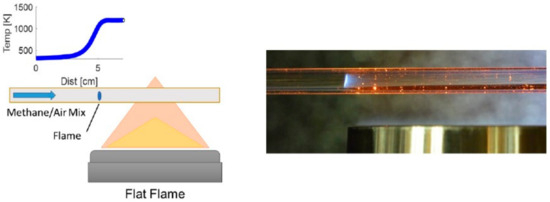 The computational study of the present work is validated by an earlier experimental method [33], where an optically accessible microreactor with a controlled temperature profile was used in order to explore stoichiometric fuel/air mixtures of methane and other hydrocarbons, under velocities ranging from 0.2 m/s to 0.6 m/s. In this experimental work, two main flame modes were observed: (a) stable flames at higher inlet velocities and (b) unstable flames (FREI) at lower inlet velocities. The experimental arrangement is shown in Figure 11, in which the premixed fuel/air mixture flowed through a 2.3 mm diameter quartz tube, heated by a McKenna-style flat burner. The CH* chemiluminescence data were utilized to detect the flame positions, where the CH* signals were captured via long exposure images (with an associated optical filter). A CH* chemiluminescence profile for the FREI flame indicating the extinction and ignition limits was used to compare the numerical results with those of the experiment via the so-called FREI length metric. The maximum axial temperature, the local heat release rate (HRRaxial) at the ignition and extinction points, and the temperature contours for one FREI cycle represent such a comparative approach, as detailed in Section 3.1.2 and Section 3.1.3.