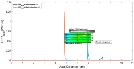 The heat release rate at the microreactor axis is also a good indication of the presence of active reaction zones throughout the computational domain, hence, the HRRaxial peaks at a developed flame region starting from the time of ignition up to the time just before flame extinction. Such information facilitates a viable comparison with the experimental data. Figure 13 presents the variation of the axial heat release rate at the ignition and extinction times for the FREI mode (with an inlet velocity of 0.2 m/s). This therefore establishes the limits of the FREI cycle and the so-called FREI length. In addition, it can be seen that the heat release rate values for both the ignition and extinction points were not identical. It is shown that the upstream end of the FREI segments (i.e., the extinction location) is where the heat release peaked. This figure also provides the configurations of the CH* radicals at the same locations detected in the experiment. With a slight deviation between the two results, acceptable agreement is evident, thereby fulfilling the validity of the computational results. The uncertainty of the presented data is attributed to the same reasons that were mentioned previously in Section 3.1.2.