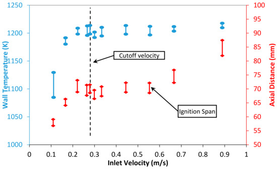 To further examine the influence of the flow inlet velocity and the imposed wall temperature on the ignition span and location, Figure 14 describes these trends and illustrates the changes in the wall temperature difference at the ignition span limits. First, it can be seen that the largest wall temperature difference was detected for the lowest inlet velocity case (a FREI case), which also coincides with the closest ignition event to the channel inlet. It was noted that closer to the inlet, the wall temperature was still low and increasing axially, which exacerbates the flame instability, resulting in a FREI mode. In addition, it was found that the ignition location for both stability modes was affected by the inlet velocity, i.e., higher inlet velocities drive the unburnt fuel/air mixture further down the reactor before arriving to the required ignition temperature, which also directly affects the residence time. At the left-hand-side of the cutoff velocity, the flame front propagated upstream towards the inlet, where the wall temperature was low enough to maximize the wall heat losses and led to flame extinction. As for the stable flames (right-hand side of the cutoff velocity), the ignition span increased as the wall temperature profile became uniform and the wall temperature difference at the ignition span limits was minimal. This also reveals that at the uniform wall temperature region, the high temperature zone in the channel grew, providing an optimum environment for the flame to reside and stabilize. These observations assert that temperature is the key parameter to ensure the ignition process, while the ignition location is dominated by the inlet velocity.
