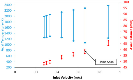 The stable flame metrics are presented in Table 5 (various inlet velocities exceeding 0.24 m/s at and with a channel diameter of 2.3 mm). It is seen that an increase in the inlet velocity resulted in the formation of a wider flame span stabilized further downstream, consistent with the literature [28,34]. Overall, it can be inferred that with relatively higher inlet velocities, the combustion process was more stable—the wall temperature at the stable flame location was relatively high and the heat loss was therefore relatively low. This resulted in achieving a stable flame, where the flame speed balanced the flow velocity. Figure 15 shows how the axial temperature across the flame span varied. Similar to the ignition span, it can be concluded that the flame span was directly proportional to the temperature across the flame. This is explained by the fact that the propagating flame stabilized where the wall temperature was still high and the axial flame temperature difference across the flame span was minimal. Such conditions diminished the heat loss effect through the walls and sustained ideal conditions for the flame to stabilize. Additionally, the flame span did not change significantly with the inlet velocity; however, the temperature range across the flame span increased with higher inlet velocities (at higher inlet velocities, the stabilized flames reside further downstream with higher wall temperatures).