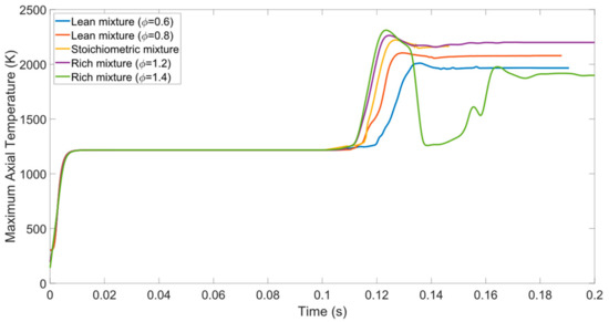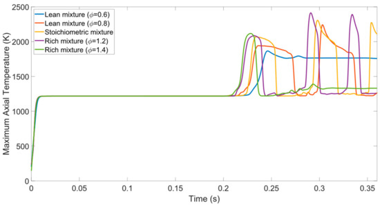 The impact of the equivalence ratio on the FREI characteristics was analyzed using a channel diameter of 2.3 mm. In particular, Figure 17 depicts the maximum axial temperature data for five various equivalence ratios with the same inlet velocity of 0.2 m/s. It is shown that for , the FREI mode was maintained; however, the FREI characteristics, such as the FREI period and maximum axial temperature, were variable. For instance, it is evidently shown that the higher the equivalence ratio, the earlier the ignition occurs since the hot region (where the ignition event is initiated) developed at a faster rate for the richer cases as compared with the leaner ones. This also can be inferred from the peaks of the maximum axial temperature profiles, as the highest temperatures were detected at higher ; see Figure 17. Additionally, the maximum axial temperature profiles for the first ignition cycle notably differed for each regime (the subsequent FREI cycles were affected by the burnt products left after the first extinction). Additionally, the lean case represents the largest period for a single FREI cycle among the three cases, where it took longer for the flame to extinguish (see Table 9). Increasing above a certain limit will eventually lead to flame quenching, due to a relative lack of the oxidizer in the mixture, and this is evident for the richest mixture here (). In this case, the flame did not sustain after the initial ignition. In contrast, for the leanest mixture (), the FREI mode was no longer seen, and the flame experienced a stable mode, indicating the very important role of the equivalence ratio in altering the flame stability limits. In some cases, therefore, the equivalence ratio can be used as a controlling factor to stabilize the flame.
