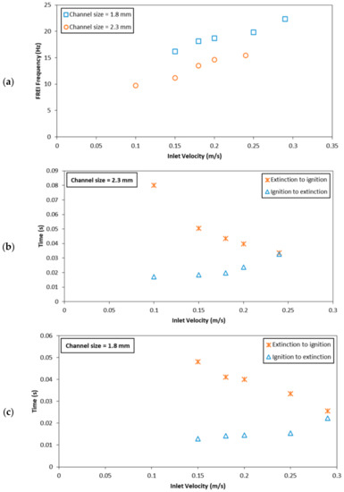 (a) The frequency of the FREI vs. the inlet velocity. (b,c) The time from ignition to extinction and extinction to ignition for two channel diameters, 2.3 mm and 1.8 mm, all with a stoichiometric fuel/air mixture.