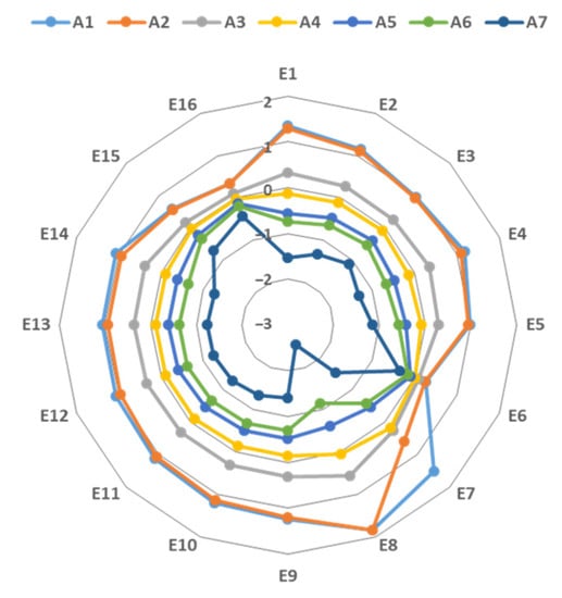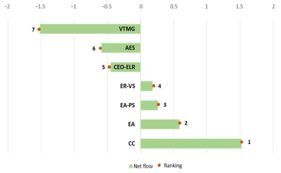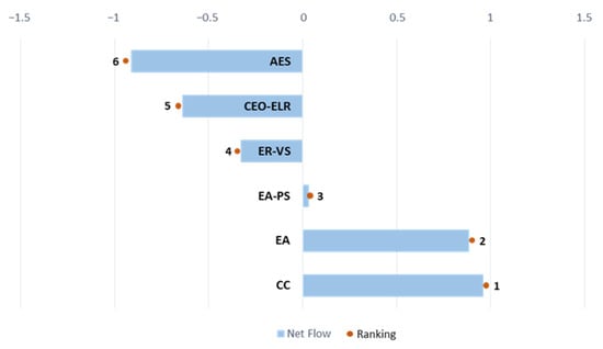 In this study, the PROMETHEE II method, extended into a fuzzy environment, is used to obtain a complete CES business model ranking, utilizing existing studies that introduced the fuzzy set theory to the PROMETHEE method [,], which can avoid detailed uncertain information loss. The assessment of performance evaluation problems is limited to experts’ subjective judgement, which is difficult to directly calculate or rank. PROMETHEE I may lead to some information loss as experts’ opinions are subjective in nature with partial information on the ranking, whereas PROMETHEE II is more complete and eliminates incomparability. In addition to this, Fuzzy is used to address MCDM problems, which are uncertain and vague, thus rendering it difficult to prioritize the alternatives in some cases.