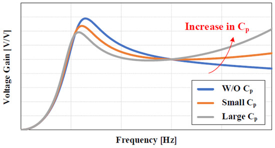 Voltage gain curve of actual LLC resonant converter with each parasitic capacitance.