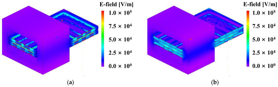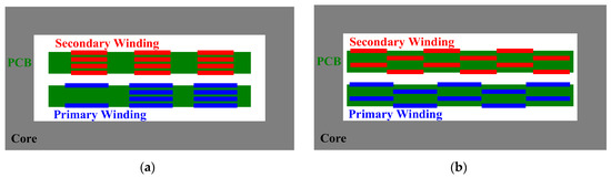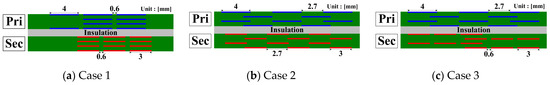 JMAG simulation parasitic measurement results according to PCB pattern arrangement. (a) Maximum pattern overlap. (b) Minimum pattern overlap.