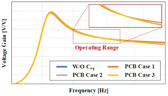 Parasitic capacitance simulation results according to PCB pattern arrangement.