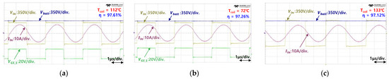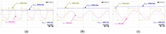 Experimental waveforms and efficiency of the LLC converter according to the battery voltage. (a) Vbatt = 440 V. (b) Vbatt = 600 V. (c) Vbatt = 820 V.