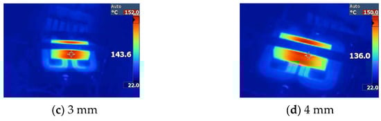 Thermal image of the planar transformer. (a) 3 oz/2 mm. (b) 3 oz/2.5 mm. (c) 3 oz/3 mm. (d) 3 oz/4 mm.