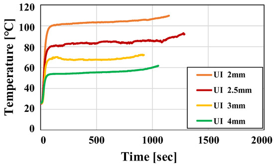 Transformer pattern temperature measurement results over time. (a) 3 oz/2 mm. (b) 3 oz/2.5 mm. (c) 3 oz/3 mm. (d) 3 oz/4 mm.