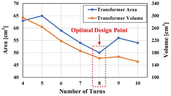 Transformer area and volume according to the number of turns.