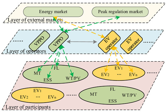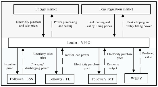 With the diversification of the main resources involved in the electricity market, when the aggregated members of the VPP belong to different stakeholders, there is a conflict of interest or correlation between the subjects. When the VPP realizes internal and external interaction, its interests should also be taken into account. At this time, the optimal scheduling of each subject within the VPP can be studied through game theory [20]. The Stackelberg leader–follower game is widely used in multi-agent VPP-bidding decision problems [29,30]. Yu et al. [26] proposed a master–slave game-based VPP internal electricity purchase and sale price formulation method in the spot market environment, which improved the economic benefits of each member. Sun et al. [20] proposed a three-tier interactive internal and external coordination bidding strategy for the VPPO. It participates in the energy market and the peak shaving market externally, and coordinates with each member internally. However, when the VPP is limited by capacity and characteristics of internal flexible resources, there will be a problem that it cannot participate in the bidding of the peak shaving market due to small differences in some periods. In order to solve the problem when facing the demand of the electricity market, the VPP tends to interact with other subjects that have flexible resources in the distribution network to participate in the market bidding.
