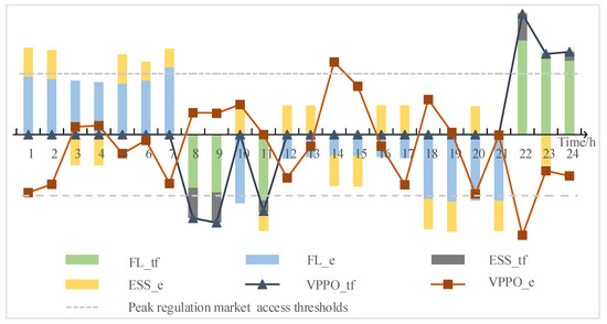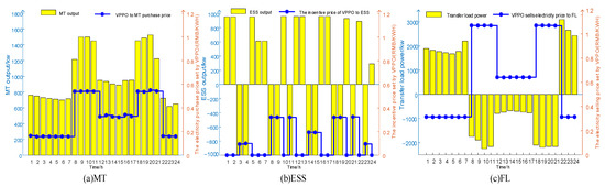 From Figure 2, it can be seen that in periods 1 and 2, due to the limitation of the VPP’s internal FL and ESS capacity and characteristics, the VPP did not reach the entry threshold of the peak load regulation market with the small differences, so it can only participate in the energy market bidding in the corresponding period. In order to solve this problem, the VPP tends to find other subjects with flexible resources in the distribution network, make up for the differences in participating in the peak shaving market, and give full play to the role of flexible resources. There are many kinds of subjects with flexible resources in the distribution system, and they participate in the electricity market as independent subjects. For example, load operators can provide transferable load, interruptible load, and shiftable load, which have advantages of stabilizing load fluctuation and reducing system peak–valley differences; integrated energy operators have advantages such as realizing the cascade utilization of multiple energy sources and promoting energy conservation and emission reduction. The vigorously developed EV clusters have been widely used in recent years; their overall orderly charging can be realized by price guidance.