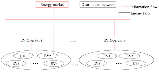 The travel space law and travel time law of EV clusters, as well as the charging power of a single user, are shown in [31]. The charging structure diagram of EV clusters in the energy market is shown in Figure 3. The EV operator is a collection of charging information for each user. The platform interacts with each user internally and presents the overall charging characteristics outwardly. Affected by the time-of-use price, some users in the EV cluster choose to charge in the low-price period to bear the lower purchase cost. The overall orderly charging of the cluster is realized finally.