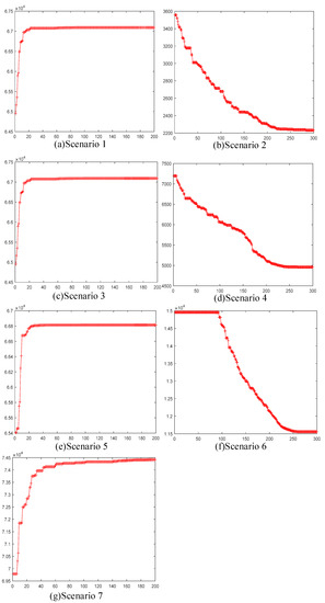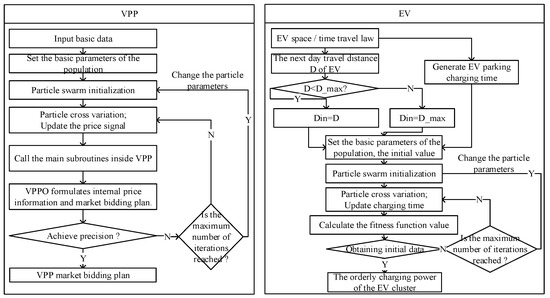 In Figure 7, the initial data are calculated, including the initial VPP market bidding scheme and the initial orderly charging plan of the EV cluster in the energy market. When calculating the initial data of the VPP, a distributed equalization algorithm combining the particle swarm optimization algorithm and the interior point method is used to solve the problem. When calculating the orderly charging power of the initial EV cluster in the energy market, the particle swarm optimization algorithm is used to solve the problem.