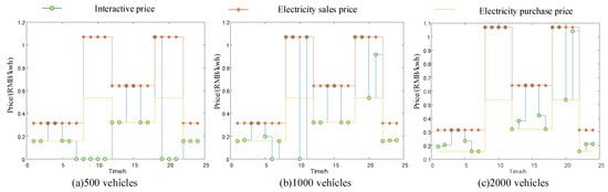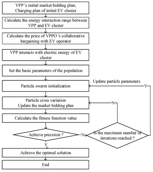In Figure 8, the power interaction range between the VPP and the EV cluster is solved, and the price of the two is calculated by time division bargaining. According to the established optimal scheduling model of the VPP multi-level power interaction, the particle swarm optimization algorithm is used to solve the problem. In order to achieve economic goals, the VPP and the EV cluster adjust their market bidding plans, respectively.