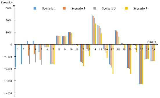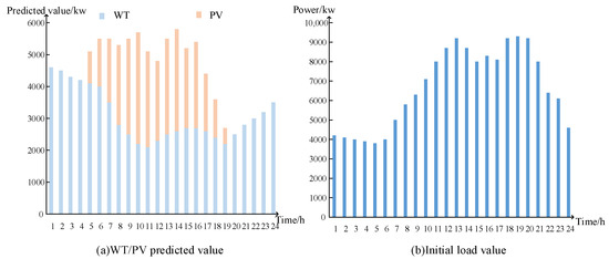 where correspond to the purchase and sale price of electricity in the energy market; is the predicted value of WT/PV; is the initial load power; is the interaction power between the VPP and the energy market (if it is positive, it indicates that electricity is purchased from the energy market, and if it is negative, it indicates that electricity is sold to the energy market, and there can only be one state in a single period of time); are the bidding powers of ESS and transfer loads in the energy market and the peak load regulation market, respectively; are the bidding powers of VPP in the peak load regulation market; is 0–1 variable (if it is 0, it means that it is not allowed to participate in the peak load regulation market, and if it is 1, it is the opposite).