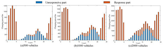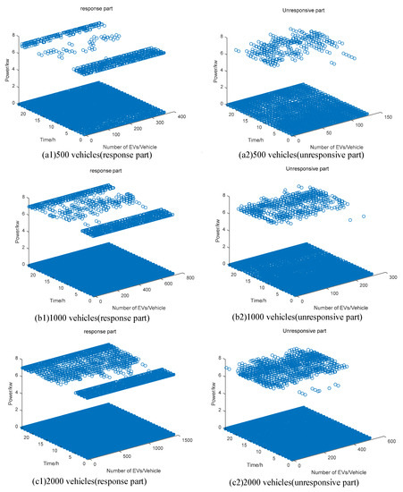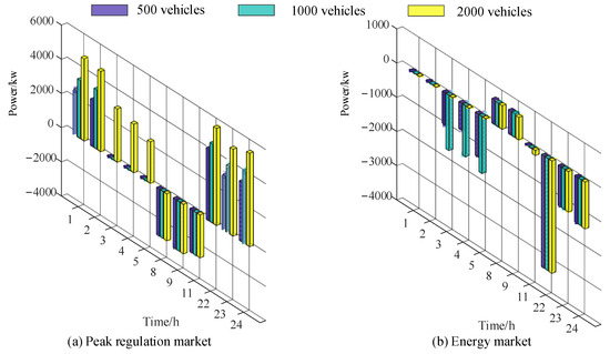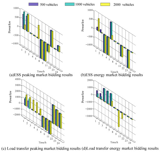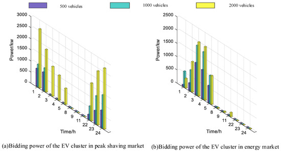 The above reflects the complementary characteristics of time and space power between the VPP and the EV cluster. Therefore, if the VPP is further interacted with the EV cluster, the demand of the two can be fully faced, and it can effectively solve the bidding problem of peak shaving market caused by VPP resources’ constraint. At the same time, some EV users have opportunities to participate in the peak shaving market.