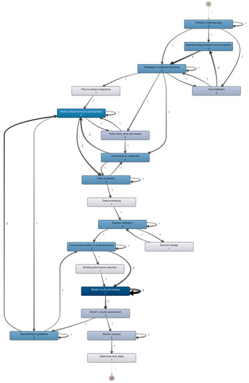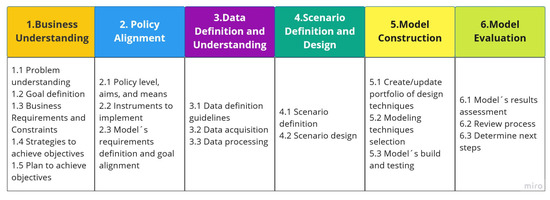 - Data Processing: The purpose of this process is to facilitate the processing of the data obtained during the preceding process, whereas some frameworks offer a broad approach to acquiring data and knowledge, they lack direction on gathering specific types of information and the methods to obtain it [21]. The data processing process in this framework covers two sub-activities: (1) examining and analyzing data to gain insights and identify patterns or trends, and (2) the assessment and evaluation of the reliability, accuracy, and completeness of data, ensuring its suitability for analysis and decision-making purposes. The previously mentioned activities are already covered within the CRISP-DM framework and are thoroughly explained in the CRISP-DM Guide [22].