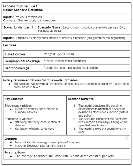 - Scenario Definition: This process implies a novel methodology within the domain of energy model development frameworks. It enhances the efficiency of policy design, promotes effective stakeholder decision-making, and assures the seamless alignment of models with policy objectives. The framework presented in this study draws inspiration from the works of Mahmoud et al. and Cao et al. [23,24]. These studies influenced this framework to provide an innovative technique for defining scenarios. The process includes the subsequent activities: (a) name the scenario; (b) define the scenario characteristics; (c) set the method by which scenarios will offer policy recommendations; (d) identify key factors and driving forces of the scenario; (e) detail the narrative and outputs of the scenario; (f) describe the underlying assumptions pertaining to the input and output data, calculations, and processes employed within the scenario; (g) clarify the potential impact of the assumptions on the resulting outcomes; and (h) determine and analyze sources of uncertainty.