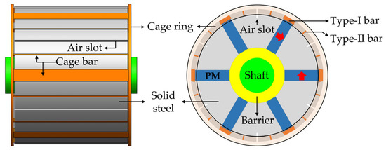 To overcome the above-mentioned challenges, a hybrid solid rotor applied in the LSPMSM is designed and analyzed in [13,14,15] by the authors. Figure 1 shows the spatial views of the designed rotor. It can be seen that the conductive solid-steel blocks rather than the laminated steel sheets constitute the main rotor body. Selection of the solid steels is based on their inherent high starting torque [9,10]. A squirrel cage is attached to the steel surface. The bars of the attached cage are divided into two groups, i.e., the trapezoidal ones with bigger areas (type I) and the rectangular ones with smaller areas (type II). When the motor is operating at the asynchronous stage, both the two types of cage bars provide the rotor with more eddy currents. As a consequence, the motor induction torque proportional to the rotor current density is lifted, and the motor starting and synchronization capabilities are improved.