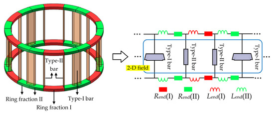 Performance evaluation of the LSPMSM with the hybrid solid rotor relies mainly on analyzing the transient motor behaviors under large amounts of operating conditions. The two-dimensional (2-D) time-stepping finite-element analysis (FEA) [17] is often selected to fulfill the extensive time-related analyses since it is able to rapidly and precisely predict the instantaneous motor outputs. It should be noted that rotor stack in the 2-D FEA model is assumed to possess an infinite axial length. Based on this assumption, the eddy currents induced in the rotor are treated as ones with only axial components. However, in practical 3-D cases, there exist two parts of non-axial currents flowing in different rotor segments. The first part is confined into the cage ring and can be taken into account in the 2-D FEA by an external cage circuit shown by Figure 2. In this circuit, the cage ring of either side is separated into two kinds of fractions. The first kind (ring fraction I) lies between the bars of type II while the second kind (ring fraction II) is sandwiched by the bars of types I and II. The two kinds of fractions are represented by their equivalent resistances and leakage inductances, respectively, i.e., Rend(I)/Lend(I) for ring fraction I and Rend(II)/Lend(II) for ring fraction II. The values of these resistances and inductances are measured by formulas in [18]. During the 2-D FEA, the type I and type II cage bars themselves are modelled as meshing elements and the current flowing inside the whole cage is calculated by inserting the electric–circuit equations into the 2-D FEA computation itself.