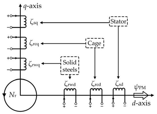 Analysis on the transient behavior of the LSPMSM with the hybrid solid rotor can be realized by solving the system equations [3]. The magnets inserted into rotor core lead to the time variation in magnetic reluctance of per-phase stator winding [26,27]. Therefore, if the coordinate system is placed on the stator, the self and mutual inductances of the three-phase stator windings will change along with the rotor rotation, making it rather difficult to solve the system equations. To address this issue, the system equations are established on a rotating coordinate system in which one axis (d-axis) is in line with the central line of the permanent magnet flux and the other axis (q-axis) is ahead of the d-axis by 90 electrical degrees [28,29]. Both the d- and q-axes rotate in synchronization with the rotor. In this coordinate system as shown in Figure 4, the original three-phase stator windings are transformed into ones of ζsq and ζsd. The cage carrying eddy currents is equaled by the windings of ζrcq and ζrcd. Similarly, the conductive solid steels are replaced by the q- and d-axis windings as ζrwq and ζrwd. The PM poles are represented by their resultant flux ψPM which interacts with each of the d-axis windings but none of the q-axis ones. All the above-mentioned motor windings share the same rotation speed of Nr. The self-inductance of each d-axis winding or q-axis winding is almost invariant and the mutual inductance between two windings located at the d- and q-axes, respectively, is almost zero. These conditions reduce the complexity of the system equations and also the solution difficulty as a result.