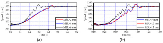 To seek the balance between the solution accuracy and the computation cost, the maximum side length (MSL) of the triangular meshing elements in the 2-D FEA model is tentatively set to be 2, 4, or 6 mm, to which the number of meshing elements/connecting nodes is 9320/7805, 6712/4729, or 5139/3765. As for the 3-D FEA model, the MSL of the pyramidal meshing elements is set to be 7, 10, or 13 mm, to which the number of meshing elements/connecting nodes is 17,608/12,515, 14,139/10,773, or 11,752/8061. Figure 6 shows the speed–time responses of the analyzed LSPMSM determined by the 2-D and 3-D FEA models with different meshing qualities. The load torque (named TL) is set to be 3390 N. ∙m and the combined inertia of rotor and load (named Jr) is set to be 10 kg·m2. It can be found that the 2-D FEA model with MSL equal to 4 mm produces a speed–time response agreeing well with that predicted by the 2-D FEA model with MSL equal to 2 mm. Similarly, there exists a good agreement between results obtained by the 3-D FEA models of which the MSLs are 7 and 10 mm, respectively. Therefore, in this work, the MSL of the 2-D/3-D FEA model is set to be 4/10 mm to keep balance between the solution precision and rapidness.