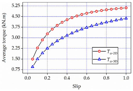 Repeating operations of step 1–4 in the 3-D FEA works out the average solid-steel induction torque under each slip, i.e., Tω-3D(si). The relationships of Tω-2D(si) and Tω-3D(si) versus slip are displayed in Figure 8. It can be seen that under each slip, the value of Tω-2D is bigger than that of Tω-3D. The value gaps can be explained by the current–component differences of the 2-D and 3-D solid steels. In the 2-D solid steels, all the induced currents which comprise axial components and their flowing paths are as long as the rotor stack. Thus, all the steel currents contribute as the effective ones to generate the torque. However, in the 3-D solid steels, the non-axial currents in end regions push the axial ones into the middle portion of the steel body. As a result, the effective currents for torque production have flowing paths shorter than the rotor stack and hence lead to the torques turning smaller.