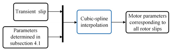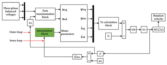 Figure 12 shows the model block distributions in the tool window. There are two loops in the model. The outer loop applies the time integral of the rotation speed, i.e., the rotor position, to the input of the d-q transformation block to obtain the q- and d-axis stator voltages. The inner loop works out the transient motor parameters by an interpolation block. Figure 13 shows the interior view of the interpolation block. In this block, the parameters determined in Section 4.1 are set as the known quantities. The parameters whose relevant slips are not covered by RS are calculated by the cubic-spline interpolation method.