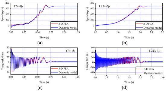 The steady-state stator-winding currents and torques under slips of 0.2 and 0.8 are predicted by the dynamic model and compared to those of the 3-D FEA in Figure 14. The transient speed–time and torque–time responses under load conditions as 1 TN-1 Jr and 1.2 TN-3 Jr are calculated by the dynamic model and compared to those of the 3-D FEA in Figure 15. Taking the results of the 3-D FEA as the standard values, the mean relative errors (MREs) of the dynamic model outcomes are summarized in Table 1. Calculation of the MRE follows