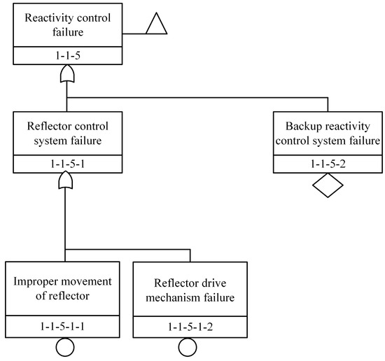 To determine the initiating events of SIMONS using the MLD method, the target event has to be selected first. SIMONS benefits from the excellent fuel element performance and the design of passive residual heat removal system, which does not suffer from “core meltdown” like the pressurized water reactor. Moreover, the use of radioactive release as a consequence of PSA analysis for modular high-temperature gas-cooled reactors has been confirmed [22]. Therefore, SIMONS takes radioactive release as the target event of the main logic diagram and based on SIMONS’ current conceptual design, starting from the three major safety functions of the reactor (reactivity control, residual heat removal, and radioactive containment), identifies the frontier systems that lead to the failure of the corresponding safety functions. Then, the support equipment leading to the failure of the frontier systems is determined according to the failure of the frontier system. After reasoning and listing the events layer by layer, the bottom-level events grouped by category are finally obtained as the list of initiating events of SIMONS. Some explanations of shape symbols used in main logic diagram can be found in Appendix A.