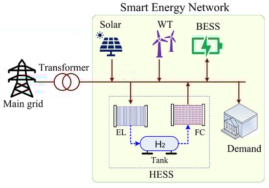 Basic structure of the grid-connected smart energy network, which consists of solar, wind turbines (WT), flexible energy demand, battery energy storage system (BESS), and hydrogen energy storage system (HESS). The HESS consists of three main components, namely electrolyser (EL), storage tank, and fuel cell (FC). Solid lines represent electricity flow. The dotted lines represent the flow of hydrogen gas.