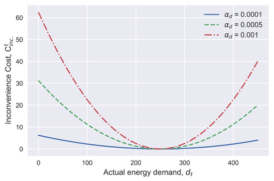 where is a small positive number that quantifies the amount of flexibility to reduce the energy demand, as shown in Figure 2. A lower value of indicates that less attention is paid to the inconvenience cost and a larger share of the energy demand can be reduced to minimise the energy costs. A higher value of indicates that high attention is paid to the inconvenience cost, and the energy demand can be hardly reduced to minimise the energy costs.