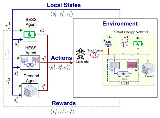 Recent studies on the optimised control of SENs having multiple ESSs like a hybrid of a BESS and a HESS are proposed in [8,30,31,32,33]. In [8,30], a DDPG-based algorithm is proposed to minimise building carbon emissions in an SEN that includes a BESS, an HESS, and constant building loads. Similarly, operating costs are minimised in [31] using DDPG and in [32] using DQN. However, these studies use a single control agent to manage the multiple ESSs. Energy management of an SEN is usually a multi-agent problem where an action of one agent affects the actions of others, making the SEN environment non-stationary from an agent’s perspective [22]. Single agents have been found to perform poorly in non-stationary environments [34].