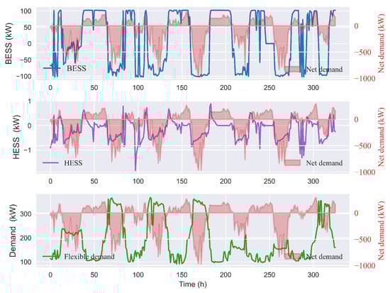 Control action results (for a 7-day period) by BESS, HESS, and flexible demand agents in response to net demand.