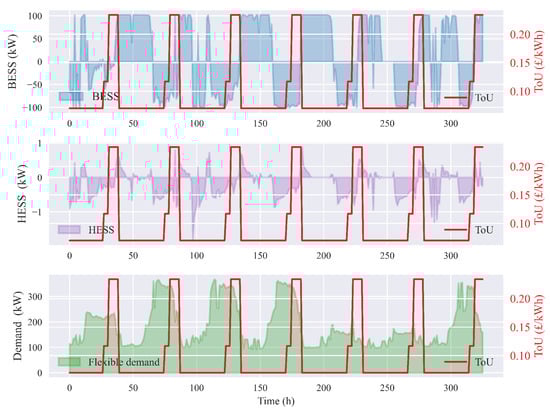 Control action results (for a 7-day period) by BESS, HESS, and flexible demand agents with response to ToU.