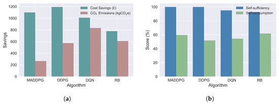 Performance of the MADDPG algorithm compared to the bench-marking algorithms for (a) cost savings and carbon emissions; (b) self-consumption and self-sufficiency.