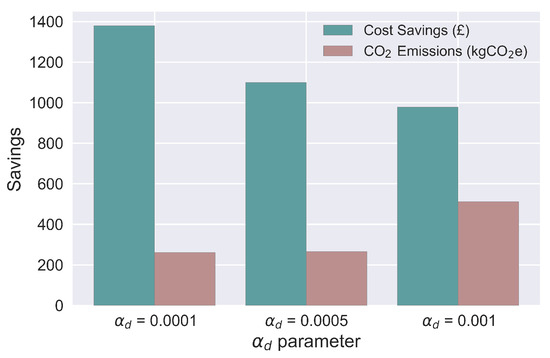 The parameter quantifies the amount of flexibility to reduce the energy demand. A lower value of indicates that less attention is paid to the inconvenience cost, and a larger share of the energy demand can be reduced to minimise the energy costs. A higher value of indicates that high attention is paid to the inconvenience cost and the energy demand can be hardly reduced to minimise the energy costs. With the change in values, the cost savings and carbon emission results are compared in Figure 9.