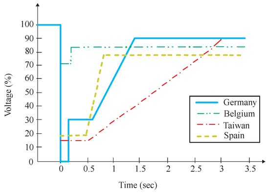 Voltage versus time characteristics provide the necessary description of the LVRT requirements. It is essentially the minimum time period for which a system can withstand the specific level of voltage sag. The minimum time that a system stays connected with the utility under voltage sag situations for some countries according to their grid codes is shown in Figure 1. To describe LVRT characteristics in a better and easy way, taking into account the German grid codes, the PV system should perform the ride through process from the fault of even zero voltage (100% voltage sag) for at least 0.15 s before isolating from the utility. For Taiwan and Spain, the minimum limit according to their grid codes is 0.5 s for voltage sags of 85% and 80%, respectively [2] (for this work, we take into consideration the grid code requirements specified for Germany). LVRT is an important requirement for the system to work properly and to provide for the loads without any interruptions. In a fault case, if multiple generating units disconnect, it would cause a breakdown of the system, which may eventually lead to a blackout.