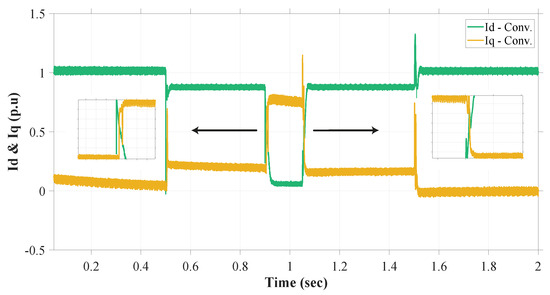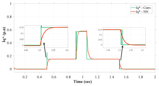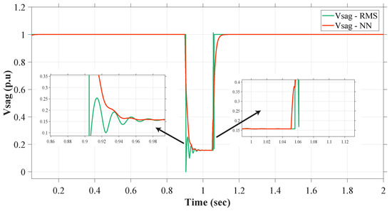 Now, for the detection of voltage sag under this second scenario and with a fault of about 38%, the proposed NN control stayed consistent with its advantages of robustness and stability. From Figure 16, it can be seen that the RMS method of fault detection is experiencing some problems in the face of undershoot at the time of fault occurrence. This distorted signal of sag detection causes further instability in the system. Again, with the overshoot at the time of fault clearance, the system might show irregular behavior because of this. Some minor delay is also observed in both the instances of changing conditions. So, because of these drawbacks, the injection of required reactive current that is attached with this signal also presents instability and some of the similar drawbacks, as can be seen from Figure 17.