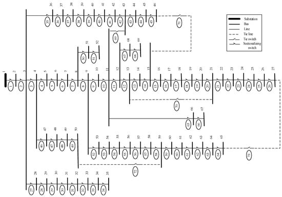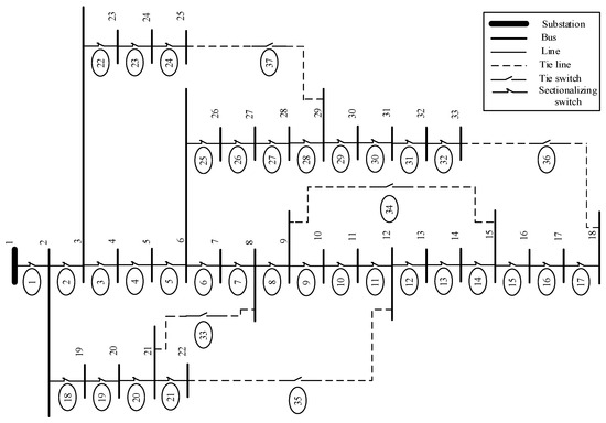 The distribution network should be in a radial form, which is the most essential constraint. The DNR works in a radial structure since it is simple to construct, design, and maintain. This minimizes the cost of construction and operational costs [49,50].