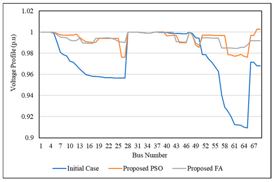 Figure 15 and Figure 16 show the voltage profile of the SSO method for the IEEE 69-bus network using PSO and FA, respectively. From the curves, all bus voltages have a value within the allowable limitation and are better than the initial case.