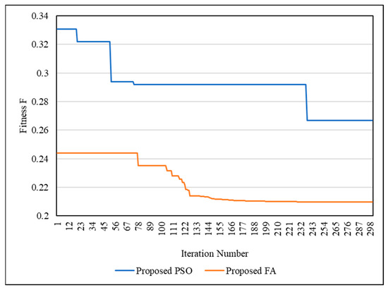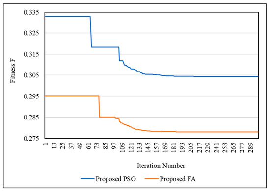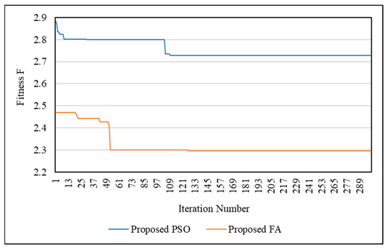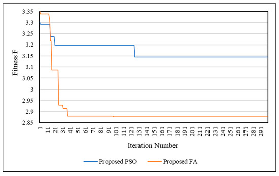 The optimization techniques’ performance was also examined using the SSO process. Figure 17 shows the convergence curves of SSO for the IEEE 33-bus network using PSO and FA. Figure 18 shows the convergence curves of SSO for the IEEE 69-bus network using PSO and FA. It is clear that FA is better than PSO in finding the optimal solution. Additionally, FA is faster than PSO. This means that FA can obtain the optimal solution through a number of iterations lower than PSO.