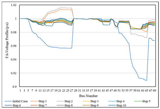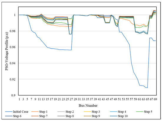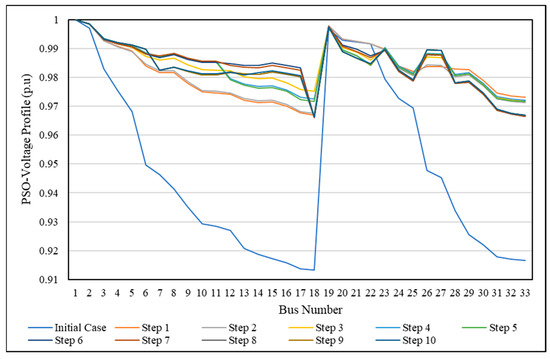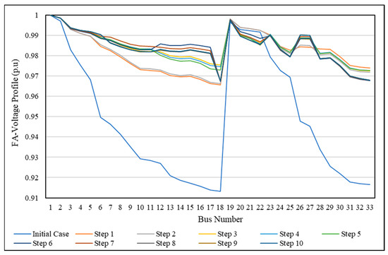For more explanation, the voltage profile during the SSO process (through each step) was compared with the initial case of the IEEE 33-bus, shown in Figure 13 using PSO and in Figure 14 using FA. It is clear that all bus voltages have a value within the allowable limitation and are better than the initial case. This means that the proposed method provides an SSO method to change the network from the initial form to the optimal form in operation mode without violating any constraints or any limitations, and without disconnecting any load from the electricity feeding.