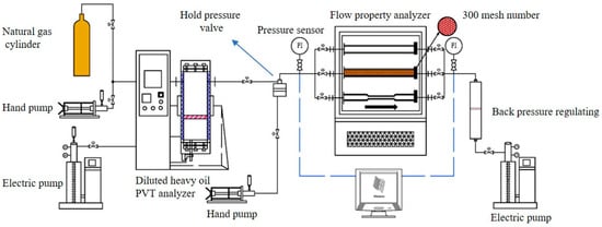 The “High temperature and high-pressure crude oil flow property test device” was used to study the deposition characteristics of asphaltene in diluted heavy oil. This device was independently developed by the China University of Petroleum (Beijing, China). The pressure sensors used for the test were produced by Senex Instruments Co., Ltd., Guangzhou, China, with a maximum accuracy of 0.1% F.S., whereas the mesh number of the system filter screen is about 300. The schematic diagram of the experimental setup is shown in Figure 1.