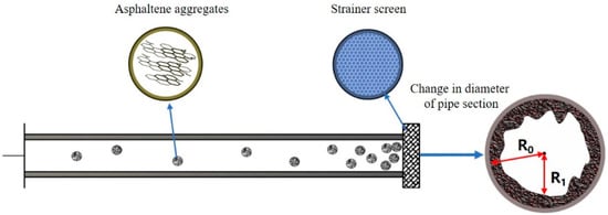 According to the formula, the pressure difference between the two ends of the tested pipeline depends on the crude oil viscosity and radius. The pressure has little effect on the viscosity of the tested oil during the constant temperature and depressurization tests []. Therefore, only when asphaltene deposits occur will the flow channel of the filter at the end of the tested pipe be blocked by asphaltene particles, resulting in a reduction of the pipe diameter, which the differential pressure sensor can detect due to a significant increase in pressure drop. A schematic diagram of asphaltene blocking the pipeline is shown in Figure 2.