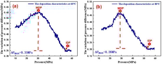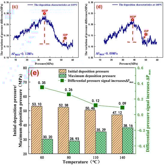 According to the production data and reservoir parameters of well A in block No. 12, the mixing light oil ratio was 1.5, and the simulated oil was tested at 60 °C, 80 °C, 110 °C, and 140 °C, respectively. The high-temperature and high-pressure crude oil flow property test device was used to execute the pump withdrawal operation. The No. 1 pump was set to feed oil at a rate of 0.10 mL/min and pump No. 2 was set at a withdraw rate of 0.15 mL/min. An isothermal depressurization test was then performed to study the deposition characteristics of asphaltene in the diluted heavy oil at different temperatures and high-pressure conditions. The pressure corresponding to the significant increase in differential pressure signal is the initial deposition pressure of asphaltene, or IDP for short, whilst that conforming to the highest point of the differential pressure signal is the maximum deposition pressure of asphaltene, or MDP for short. The difference between the maximum pressure drop and the initial pressure drop is expressed as ΔPmax. The results are shown in Figure 3.