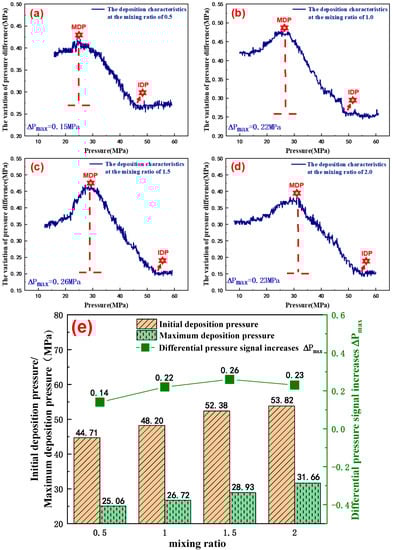 The deposition characteristics of asphaltene in diluted heavy oil at different mixing light oil ratios: (a) at the mixing ratio of 0.5; (b) at the mixing ratio of 1.0; (c) at the mixing ratio of 1.5; (d) at the mixing ratio of 2.0. (e) Pressure test of simulated asphaltene deposition in diluted heavy oil at different mixing ratio.