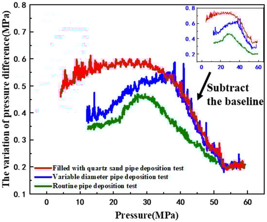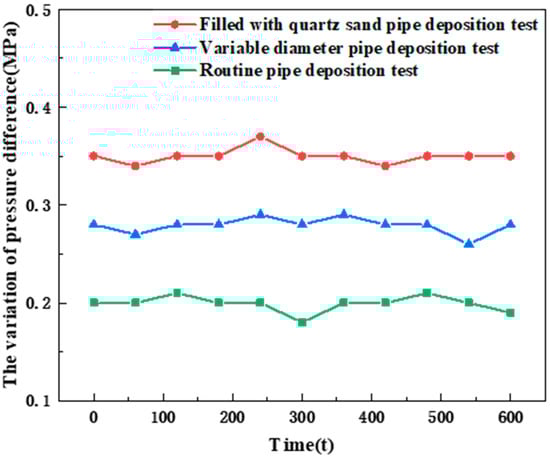 Figure 5 firstly tested the flow pressure drop of conventional pipelines, quartz sand-filled pipelines, and reduced-diameter pipelines with dilute heavy oil at constant temperature (80 °C) and constant pressure (60 MPa). After 10 min of test time, it is not difficult to find that both sand filling and pipe diameter changes caused the increase in flow pressure drop value, but the change in flow pressure drop caused by the change in pipe type can be traced. In the test results in Figure 6, the influence of pipeline change on flow pressure drop can be deducted through baseline operation.