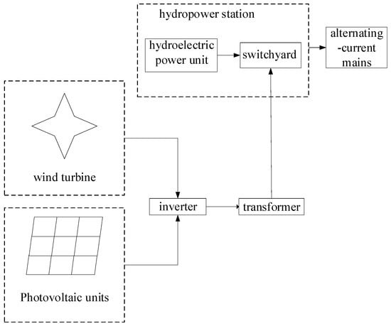 Wind, light and water, as the most easily developed and utilized energy sources in renewable energy, have developed rapidly in recent years, and are not only widely used in microgrids, but the proportion of wind and photovoltaic power generation in large power grids is also increasing year by year. However, due to the random, intermittent and fluctuating characteristics of wind and photovoltaic power generation, large-scale independent grid connections often cannot meet the requirements of a large grid, and it is necessary to have a power supply with a rapid adjustment ability to compensate and adjust in order to meet the requirements of the grid connection. At present, the most widely used is the joint operation of hydroelectric power generation. The use of hydroelectric units has the ability to quickly start and stop, adjust its output and complement wind power and photovoltaic output, which can not only effectively solve the problem of new energy grid absorption but also ensure the safe and stable operation of the grid. In addition, wind power, photovoltaic power and hydropower are usually connected to the power grid through the same grid-connected connection line. The operation control strategy is unified and optimized for a hybrid system, and even has an integrated system control strategy, which shows new characteristics that are completely different from hydropower stations, photovoltaic power stations or wind farms. A power generation system operating in this way has many advantages, including better power output characteristics, maximizing the overall benefits of the integrated power generation system through the use of novel control strategies, etc. The principles of the water–wind–light integrated power generation system are shown in Figure 1.